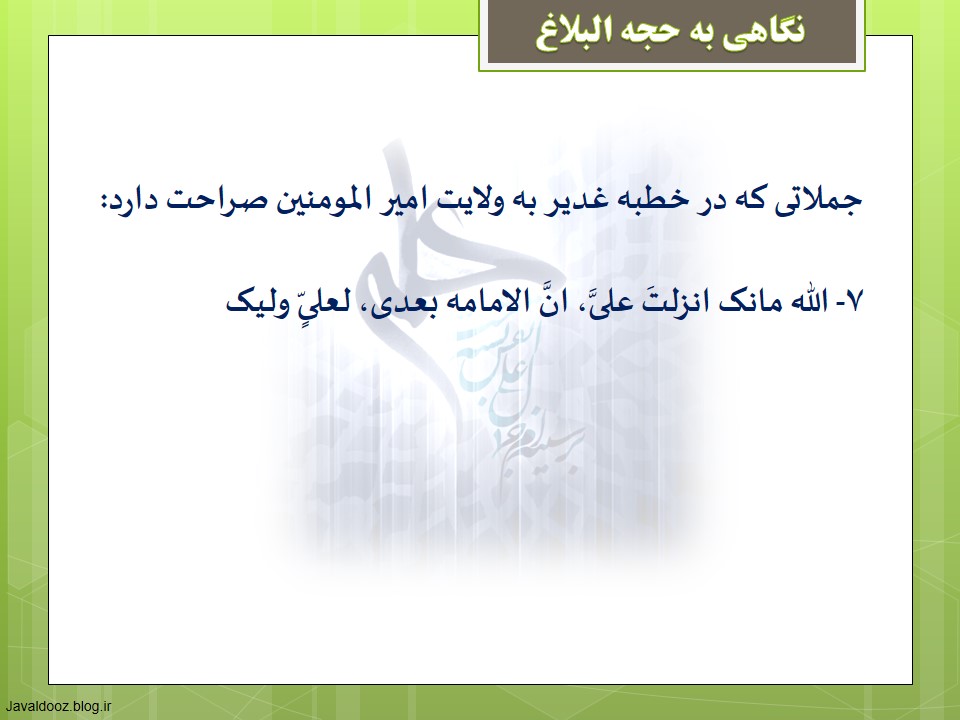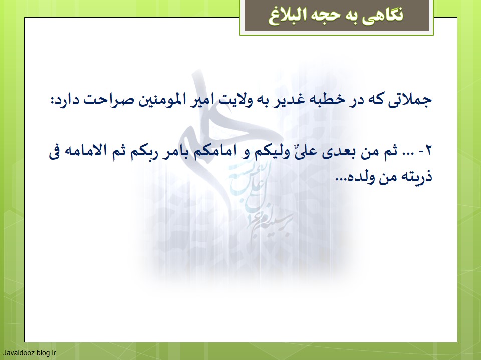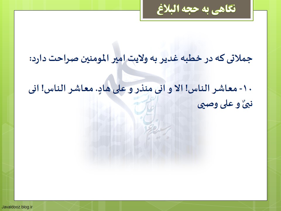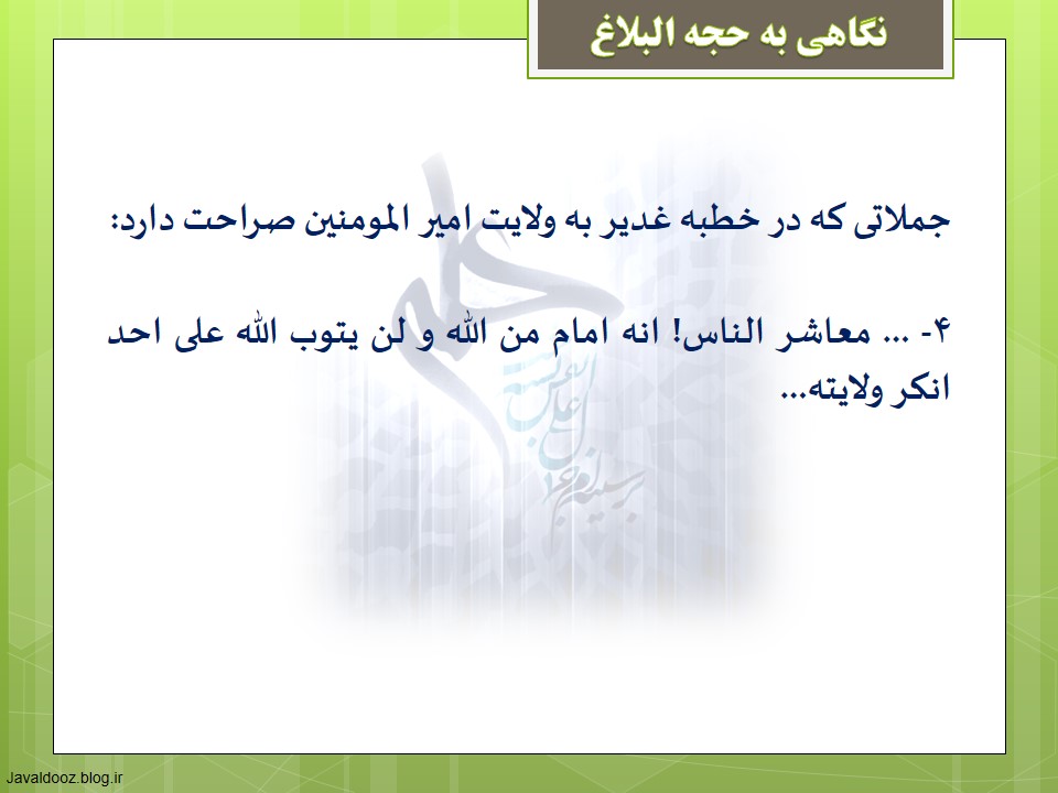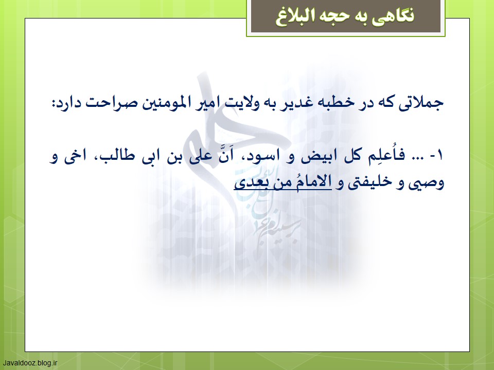 - جملاتی از خطبه غدیر که "امامت" حضرت علی علیه السلام در آن تصریح شده است. (15 مرتبه)