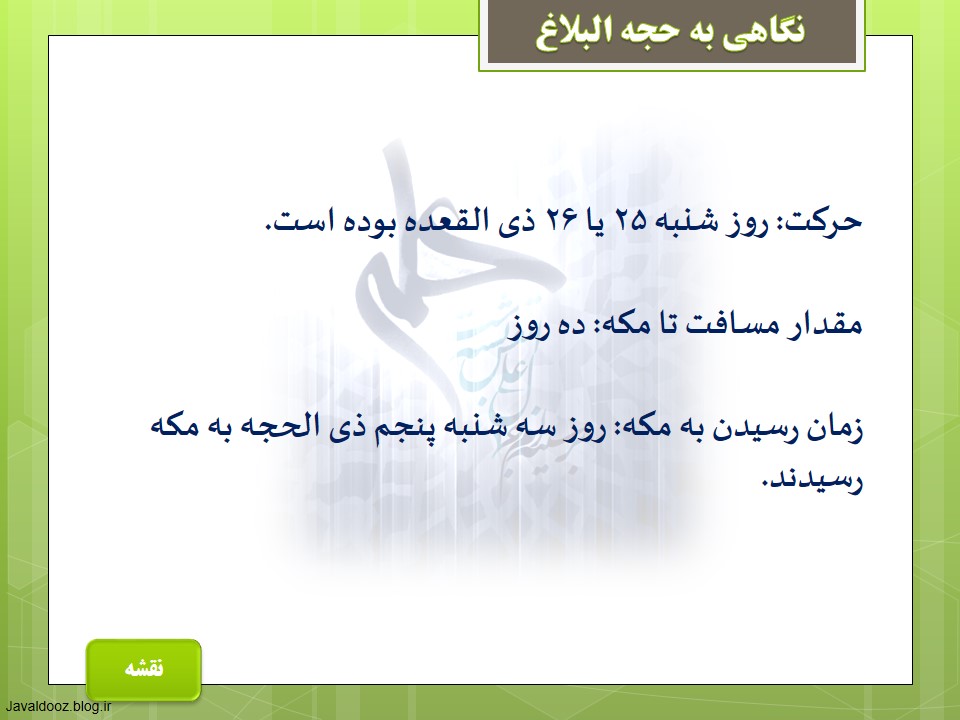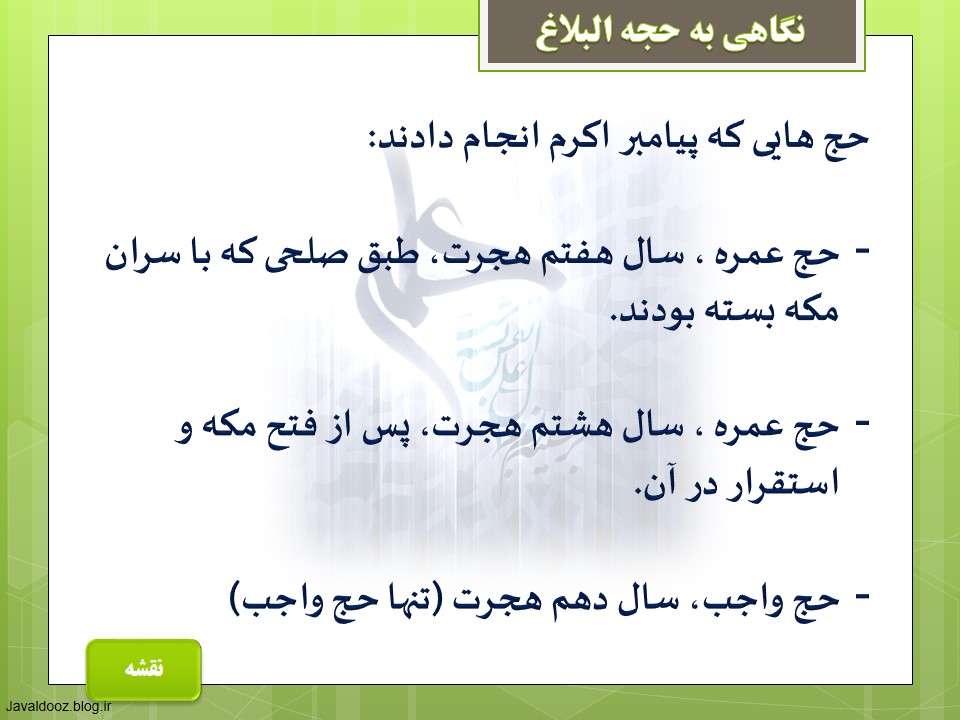 در داستان حجة الوداع، و یا تعبیر صحیح تر آن، «حجة البلاغ» نکاتی قابل توجه است که اندکی از آن ها را در اسلایدی جمع آوری کردم. ان شاء الله قابل استفاده دوستان باشد و به همت شما کامل تر شود.
